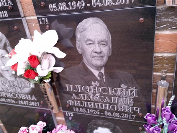 Плонский Александр ФилипповичЗаказ-наряд ФИО усопшего:Плонский Александр Филиппович (ID:2568831) Дата рождения:10.5.1926 Дата смерти:6.8.2017